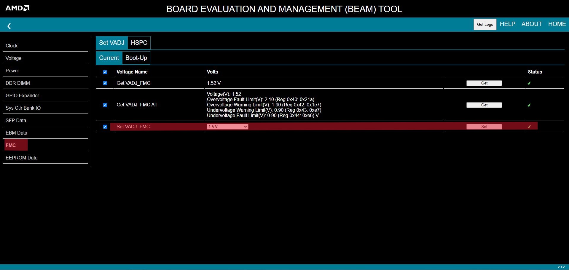To change VADJ_FMC On BEAM, click ‘Test The Board’>’Board Settings’>’FMC’. Then on ‘Set VADJ_FMC’, select 1.5V and click ‘Set’.