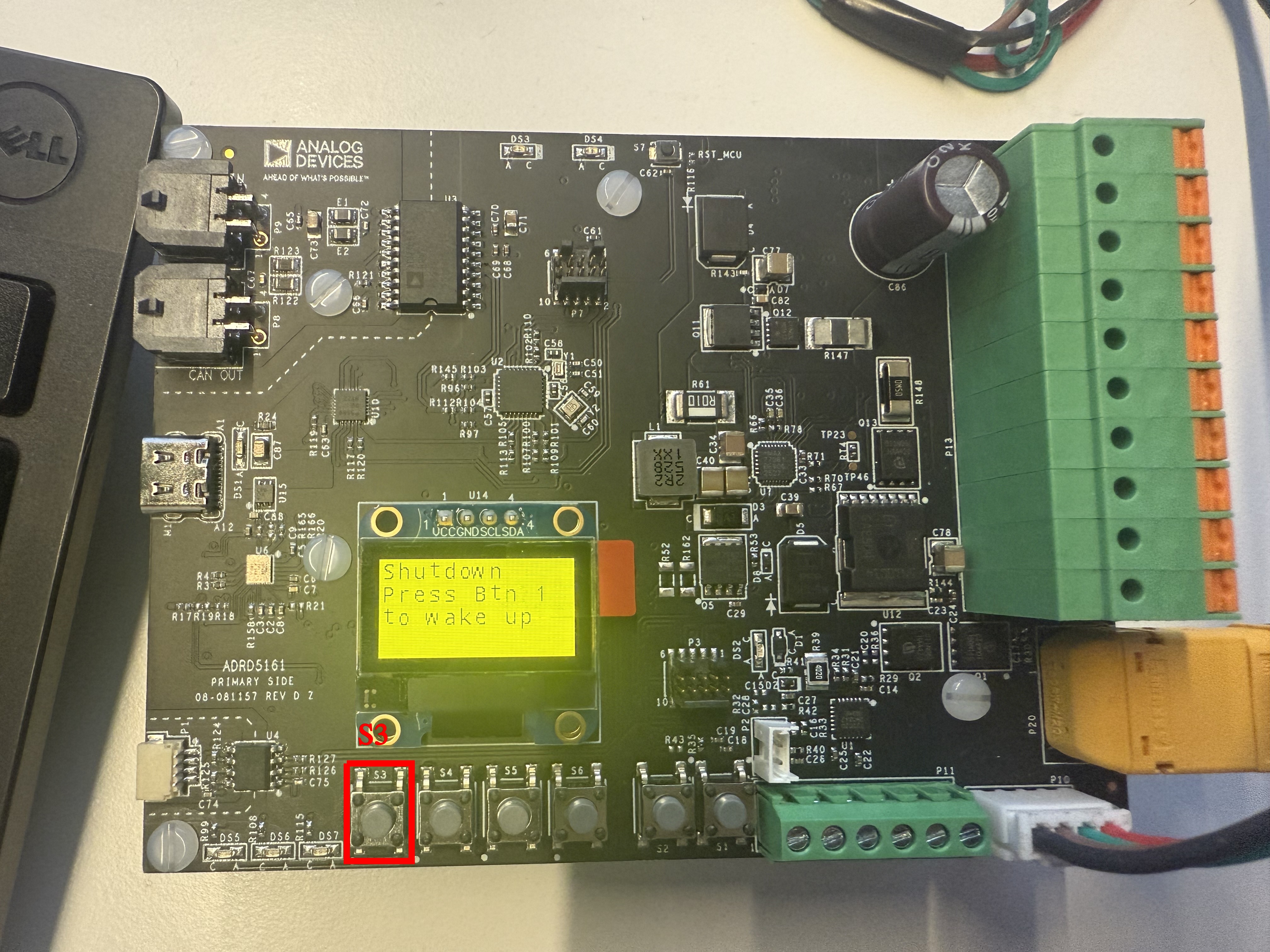 When in the Shutdown state, the ADRD5161-01Z is still powered on. However, the supply to the consumers and the CAN Transceiver is cut off. This state can be triggered either by faults appearing in the powerpath, or by pressing the designated S4 button. To exit Shutdown State, the same button must be pressed.