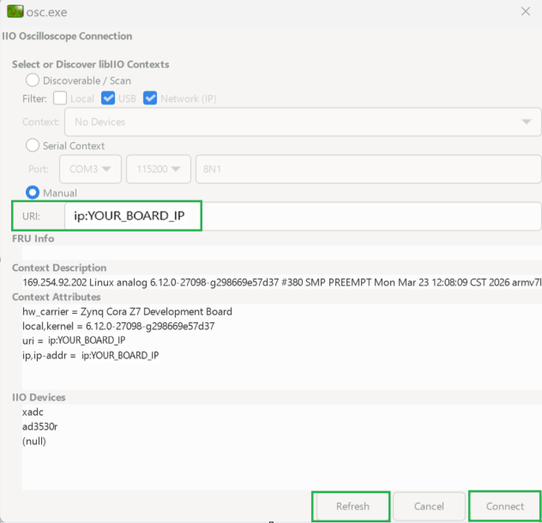 Open IIO Oscilloscope on the host PC, go to Settings → Connect, select the Manual option and enter the URI using the board IP: