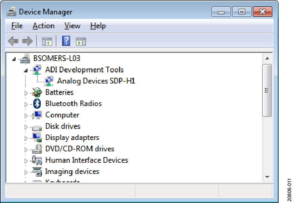 • Under System Tools, click Device Manager and use the Device Manager window to ensure that the SDP-H1 board is connected to the PC properly. If the SDP-H1 driver software is installed and the board is connected to the PC properly, Analog Devices SDP-H1 appears under ADI Development Tools in the Device Manager window, as shown in Figure 11.
