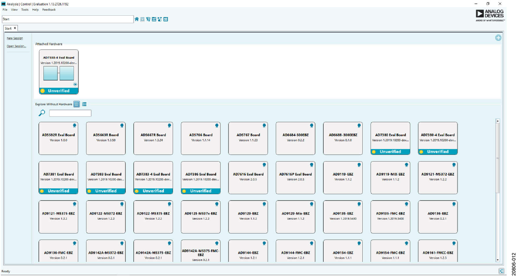 • The AD7380-4 Eval Board icon appears in the Attached Hardware section. If the EVAL-AD7380-4FMCZ is not connected to the USB port via the SDP-H1 board when the software is launched, the AD7380-4 Eval Board icon does not appear in the Attached Hardware section. In this case, connect the EVAL-AD7380-4FMCZ and SDP-H1 board to the USB port of the PC, wait a few seconds, and then continue following these instructions.