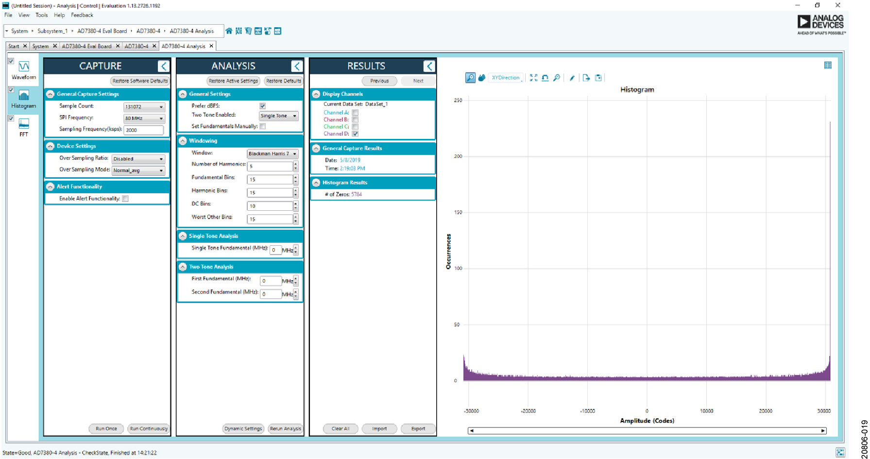 The Histogram tab contains the histogram graph and the Results pane, as shown in Figure 19. The Results pane displays the information related to the ADC performance. The histogram graph displays the number of hits per code within the sampled data. This graph is useful for dc analysis and indicates the noise performance of the device.
