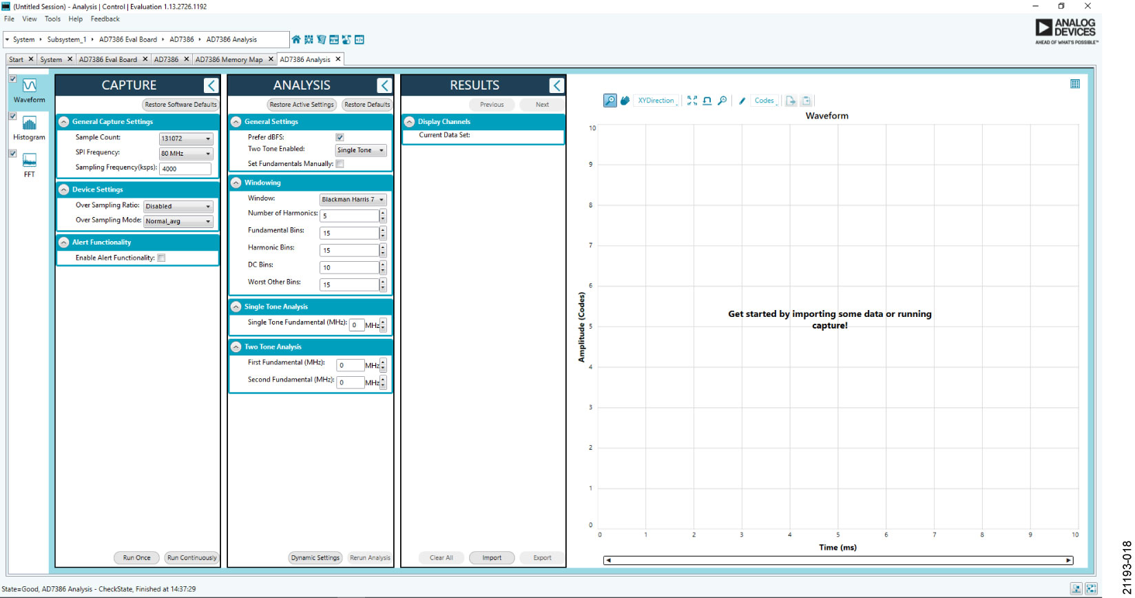 Click Proceed to Analysis in the chip view to open the window shown in Figure 18. The analysis view contains the Waveform tab, Histogram tab, and FFT tab.