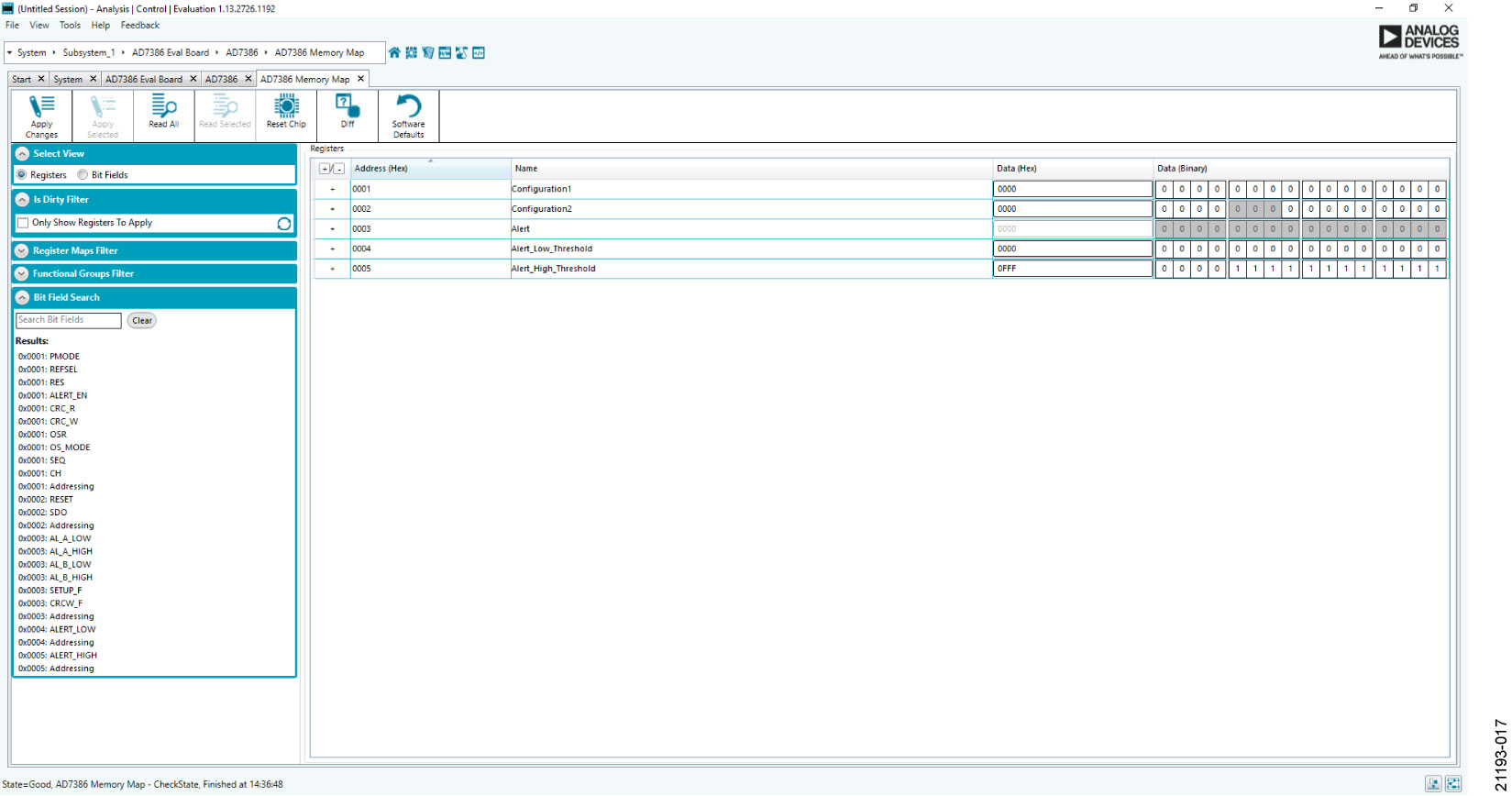 Click Proceed to Memory Map in the bottom right corner of the chip view window to open the window shown in Figure 17. The memory map shows all registers of AD7386.