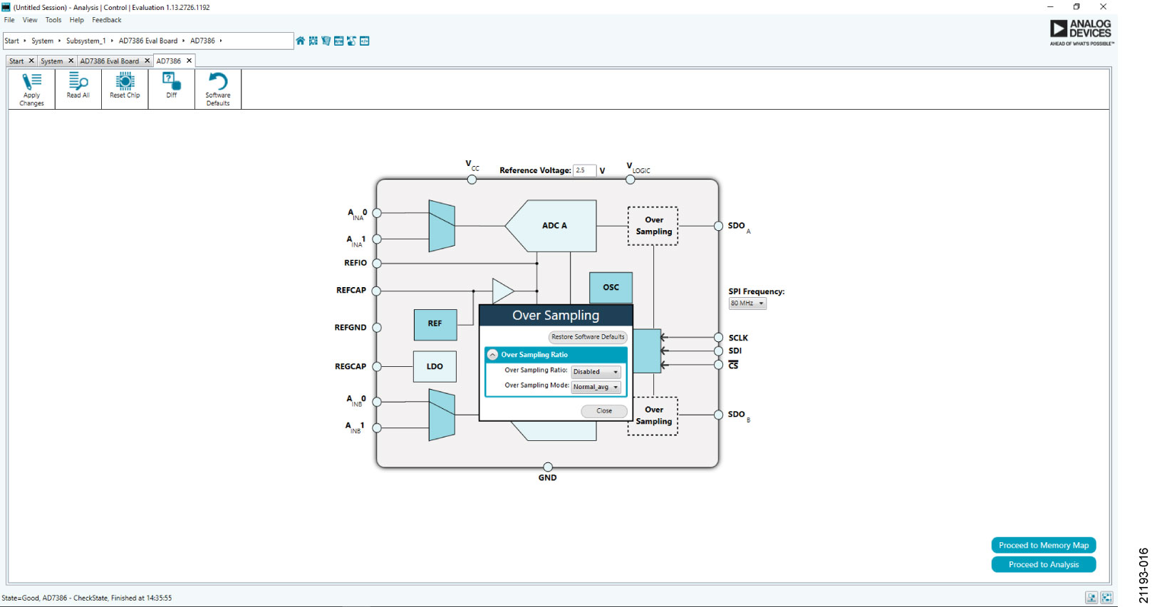Click Reset Chip to prompt the software to reset the AD7386.