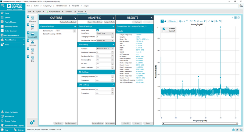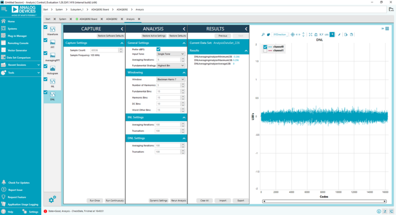 • In the ANALYSIS pane, the user can change the “windowing” type of the FFT, and also the “average iterations” when capturing the INL and DNL performance. When measuring the INL and DNL, the user should use the “Run Continuously” function and wait until it reaches the number of “average iterations” placed.