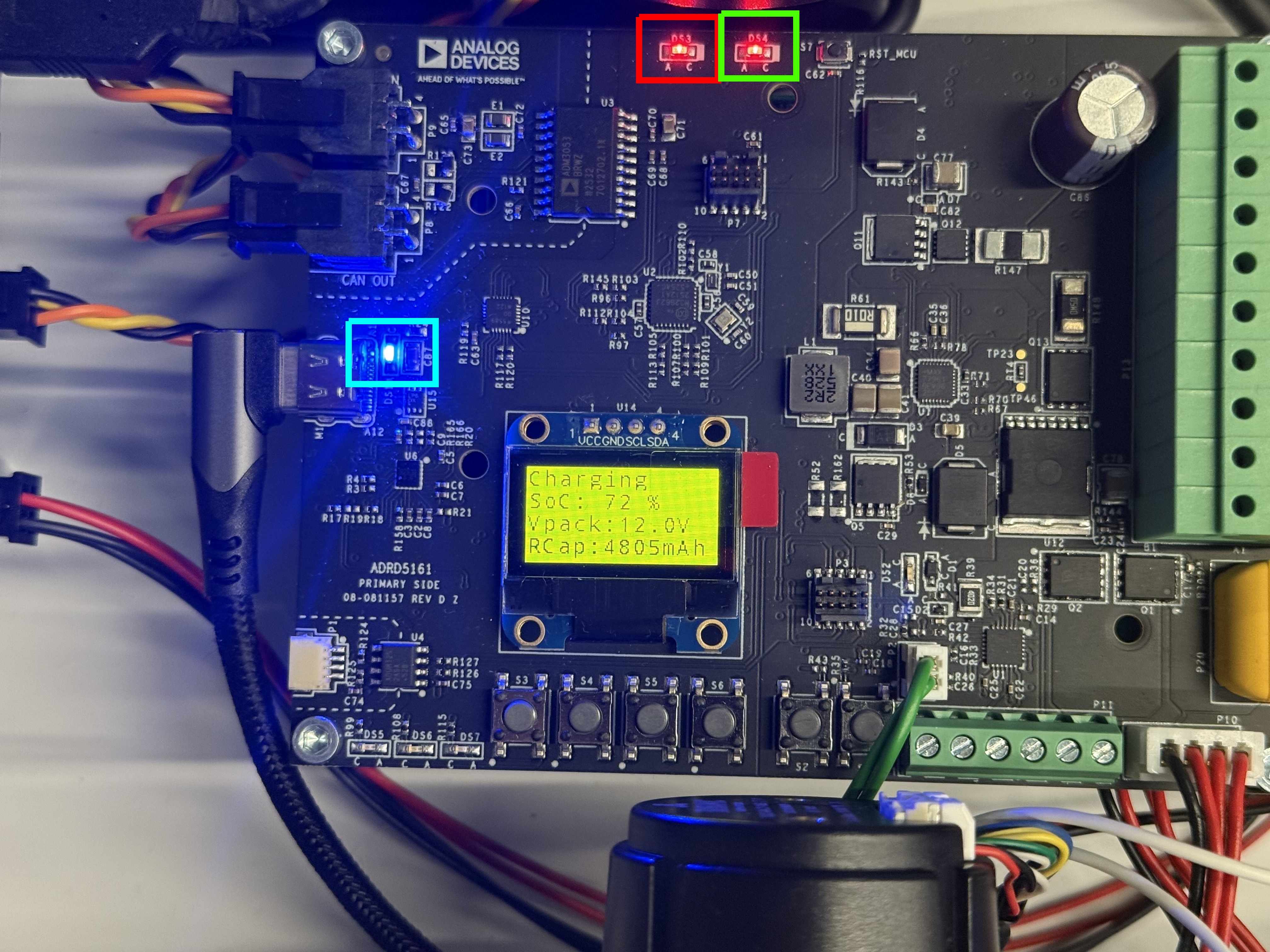 When the module is connected to an external USB-C power supply, the 3 LEDs highlighted turn on. The second red LED, highlighted with green is blinking.