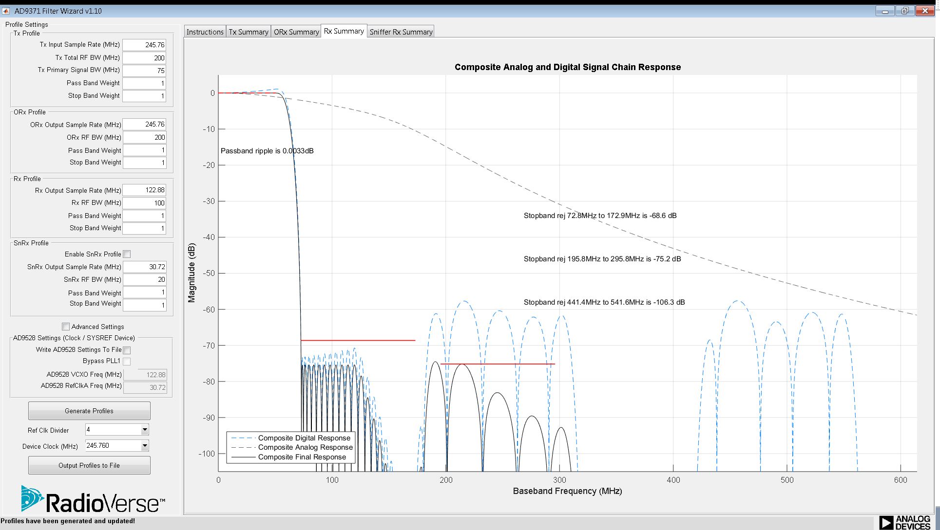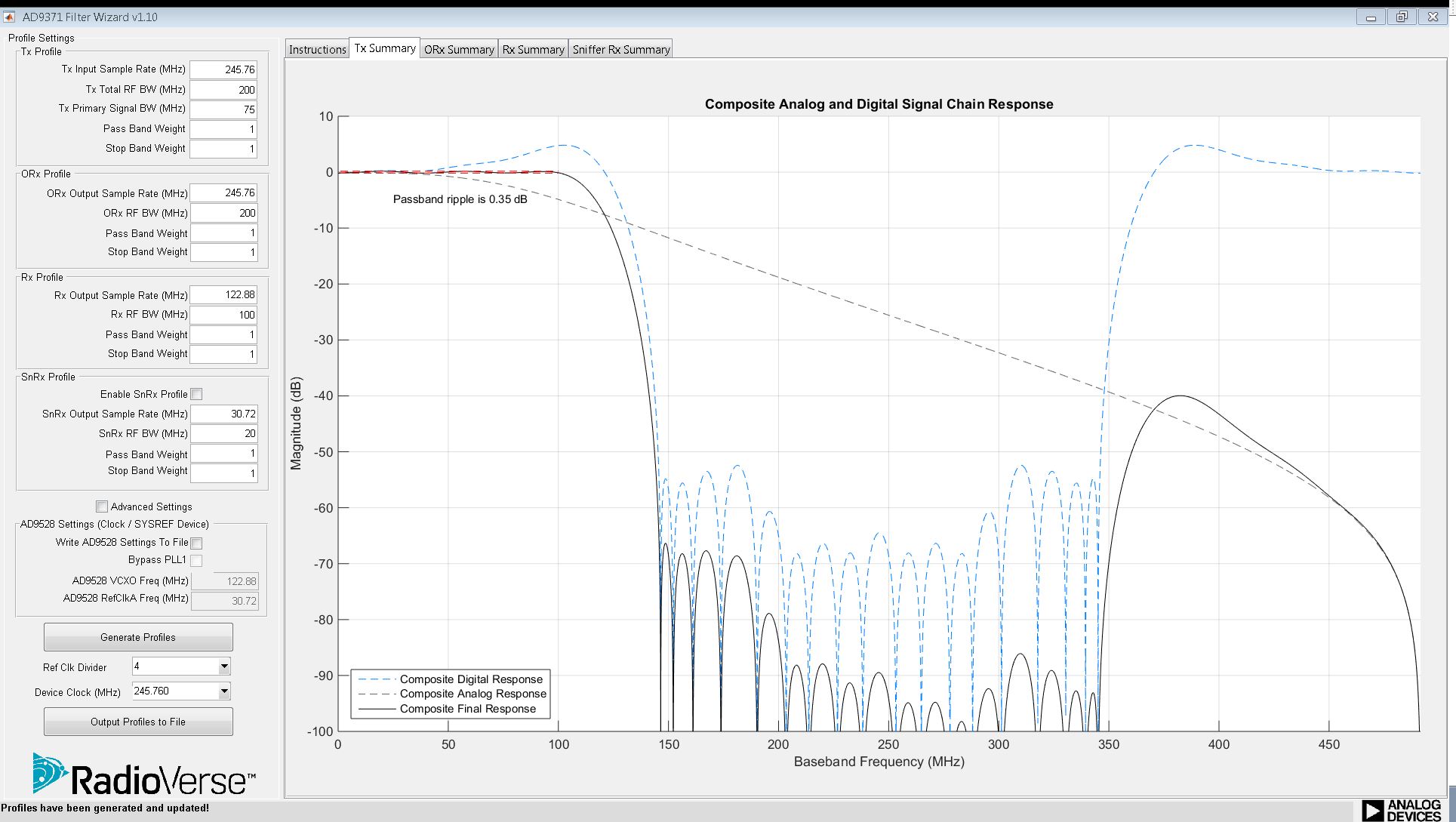 The defaults populated at startup will generate valid FIR filters if the user merely presses the “Generate Profiles” button. The window to the right will show the resulting composite response for the entire signal path as well as responses for the various blocks within the chip.