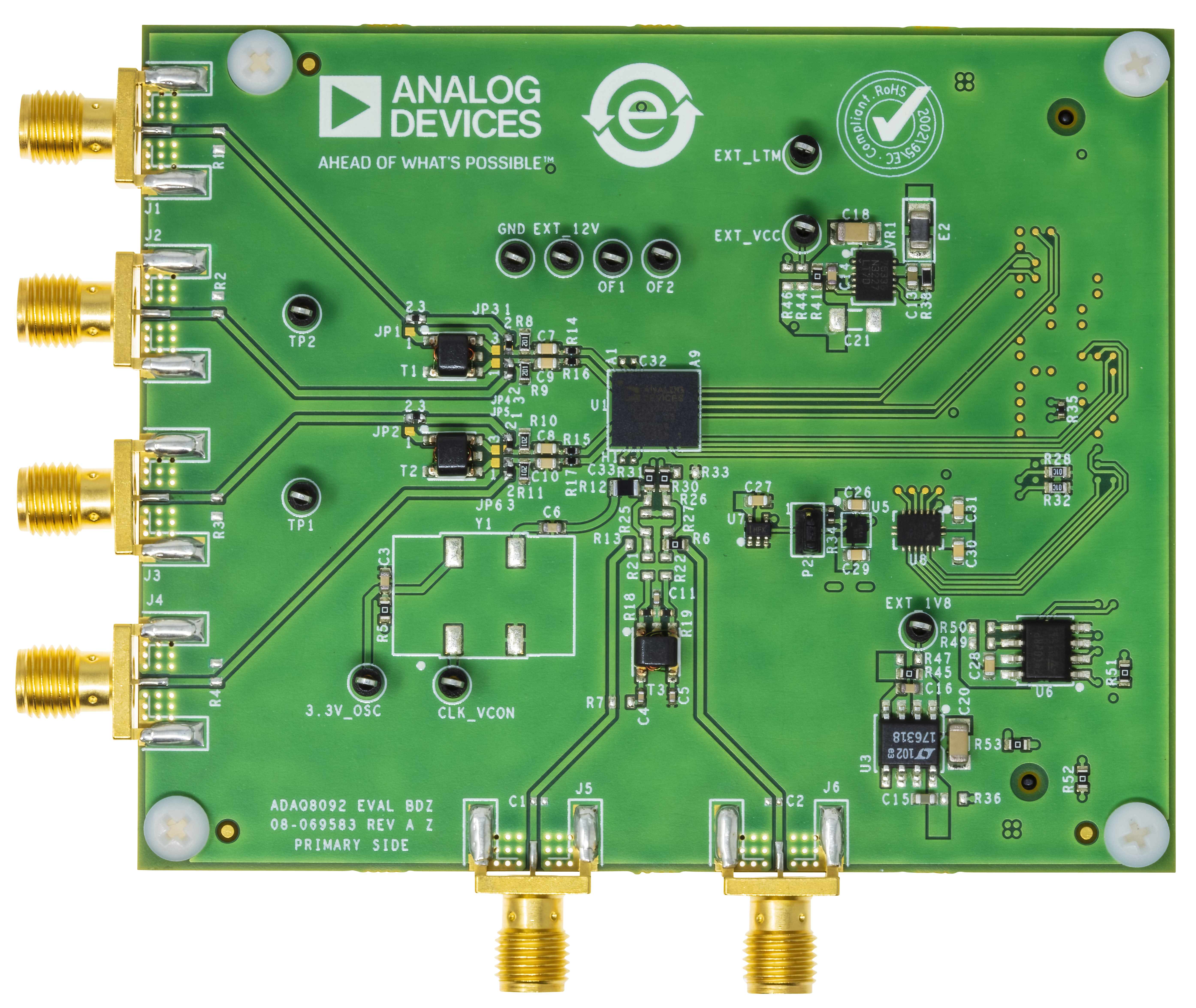 The EVAL-ADAQ8092 does not require an external power supply and requires minimal jitter in the clock source. We recommend using the DC1075B clock divider to improve the clock signal. For full details on the ADAQ8092, see the ADAQ8092 data sheet, which should be consulted in conjunction with this user guide.