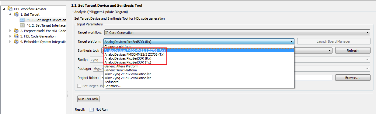 When running the Workflow Advisor the first step if to select the Target Platform. The figure below shows some of the available Analog Devices target platforms.