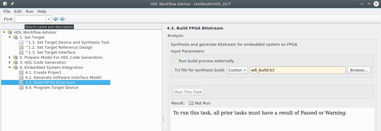 Once your SD card is ready, in step 4.3 “Build FPGA Bitstream” of HDL Workflow Advisor select a custom Tcl file for synthesis build. Utilize this adi_build.tcl file located within the BSP as your custom tcl file.