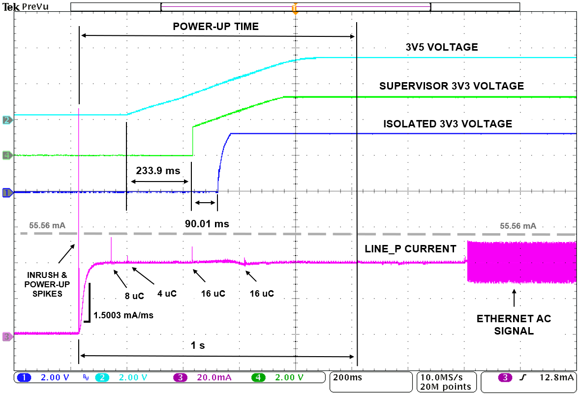 In power-up capture of the LINE_P current along with the voltages of REG_3V5, SUP_3V3 and ISO_3V3 one main observation is that the spikes are generated during the beginning of conduction of every voltage regulator (e.g., LDO and Buck Converter). If there is no power sequencing, all of these parts might start-up at the same time, failing the charge requirement on the spike from the large peak current it might generate, and may cause other failures on the reference design.
