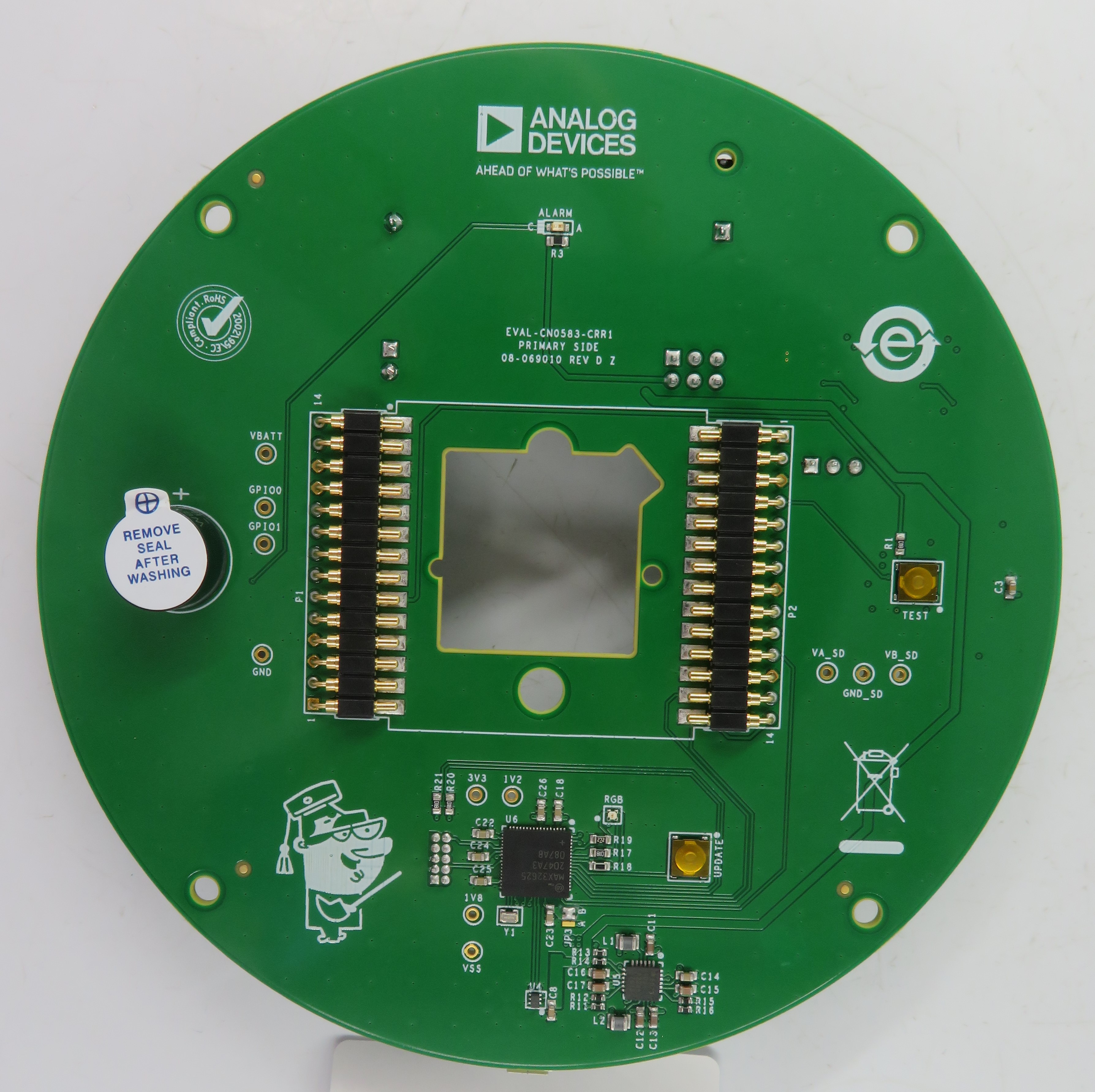 The EVAL-CN0583-SOM is a standalone module designed for development of smoke detection applications. The CN0583 SOM integrates an ADPD188BI smoke sensor, a MAX32660 microcontroller, and regulated DC power supplies needed for proper operation.